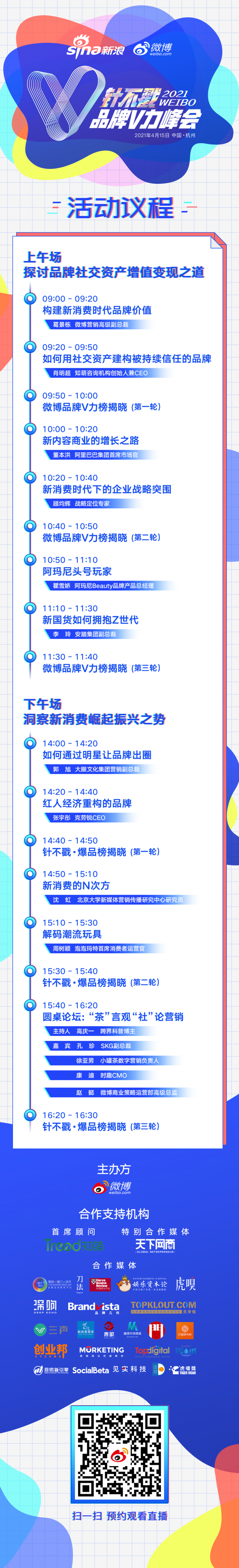 本次峰会主要分成两大部分,上午探讨品牌社交资产,发布微博品牌V力榜单;下午洞察新消费趋势,发布受Z世代喜爱的针不戳爆品榜单,揭晓当下的潮流风尚。
