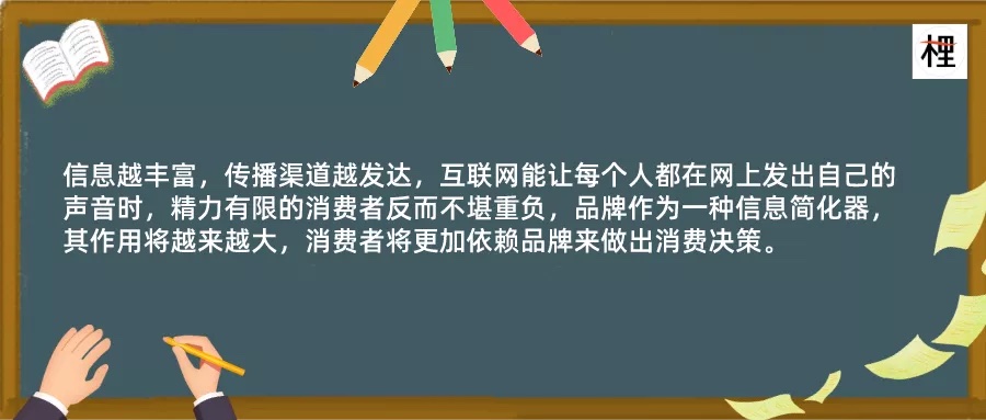 信息越丰富,传播渠道越发达,互联网能让每个人都在网上发出自己的声音时,精力有限的消费者反而不堪重负,品牌作为一种信息简化器,其作用将越来越大,消费者将更加依赖品牌来做出消费决策。