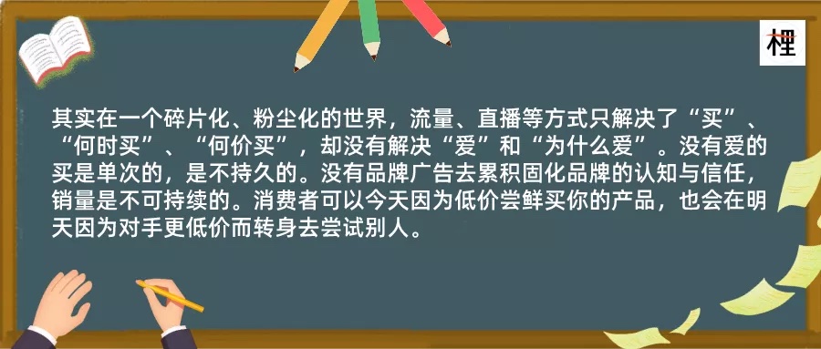 直播电商、品效合一的过度宣传,让人掉入误区,即似乎不需要品牌广告了。其实在一个碎片化、粉尘化的世界,流量、直播等方式只解决了“买”、“何时买”、“何价买”,却没有解决“爱”和“为什么爱”。没有爱的买是单次的,是不持久的。没有品牌广告去累积固化品牌的认知与信任,销量是不可持续的。消费者可以今天因为低价尝鲜买你的产品,也会在明天因为对手更低价而转身去尝试别人。
