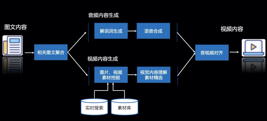百度研究院孵化出业界首个支撑通用型、大规模生产的智能视频合成平台VidPress,用户仅需一键输入新闻图文内容链接,其余全部工作则交由平台自动化完成,视频素材智能化聚合、解说词生成、语音合成、音视频对齐和渲染导出整套制作流程在9分钟以内就能生成。
