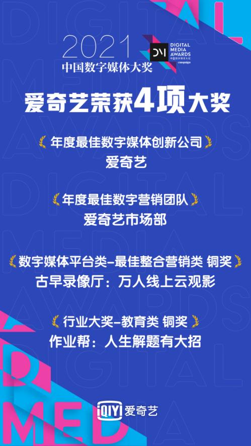 4月16日,中国数字媒体大奖Digital Media Awards 2021奖项公布,爱奇艺获得4项大奖:爱奇艺公司获得“年度最佳数字媒体创新公司”荣誉、爱奇艺市场部获得“最佳数字营销团队”、“古早录像厅:万人线上云观影”案例及“作业帮:人生解题有大招”案例分别获得“数字媒体平台类-最佳整合营销类”铜奖、“行业大奖-教育类”铜奖。中国数字媒体大奖主办方评价爱奇艺,坚持创新,在提供丰富的优质原创内容基础上,不断以技术投入内容创作,为年轻人提供了多元的观看方式与内容体验,为行业带来了更具前瞻性的营销模式。