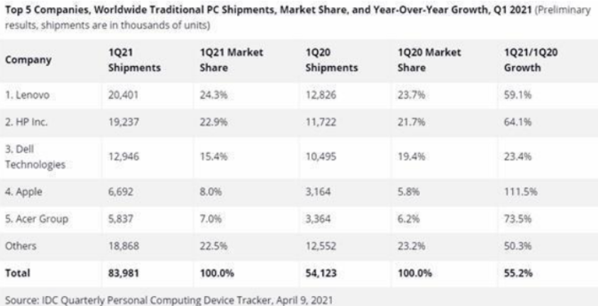 根据IDC最新报告表示,2021年首季传统电脑(包括桌面电脑、工作站电脑和手提电脑)的销量,全球共售出8400万台PC,比去年同期提升了55.2%。PC厂商已经有近10年的时间,没有这么好过了。