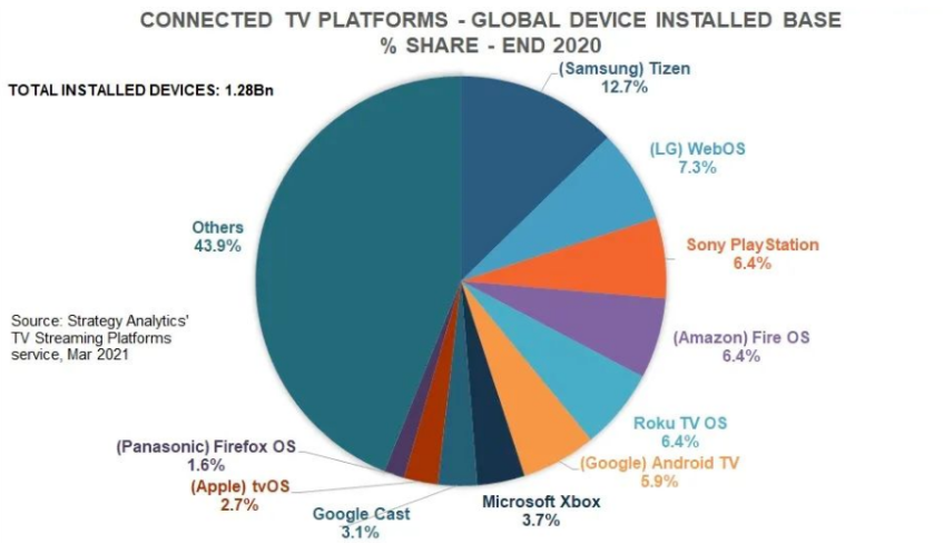 根据Strategy Analytics电视流媒体平台服务最新发布研究报告显示,全球联网电视设备(包括智能电视、流媒体设备、游戏机)销量在2020年Q4创新高,达到1.091亿台。