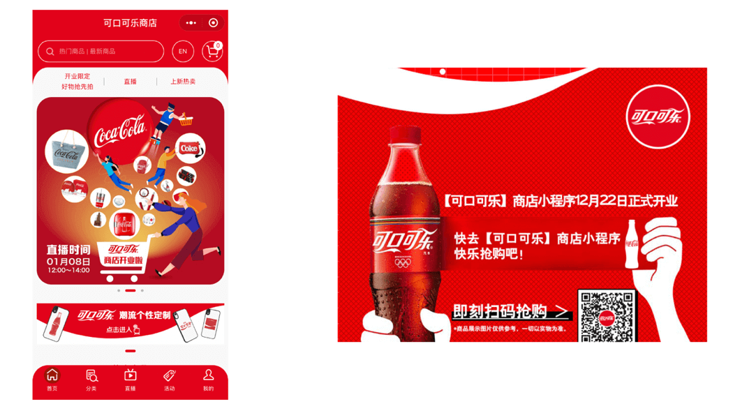 2020年12月22日,可口可乐正式开启其中国首家「可口可乐」商店小程序,店内提供多达400多个SKU的可口可乐品牌周边及品牌衍生品。此外,店内还有福袋以及限量礼盒出售。