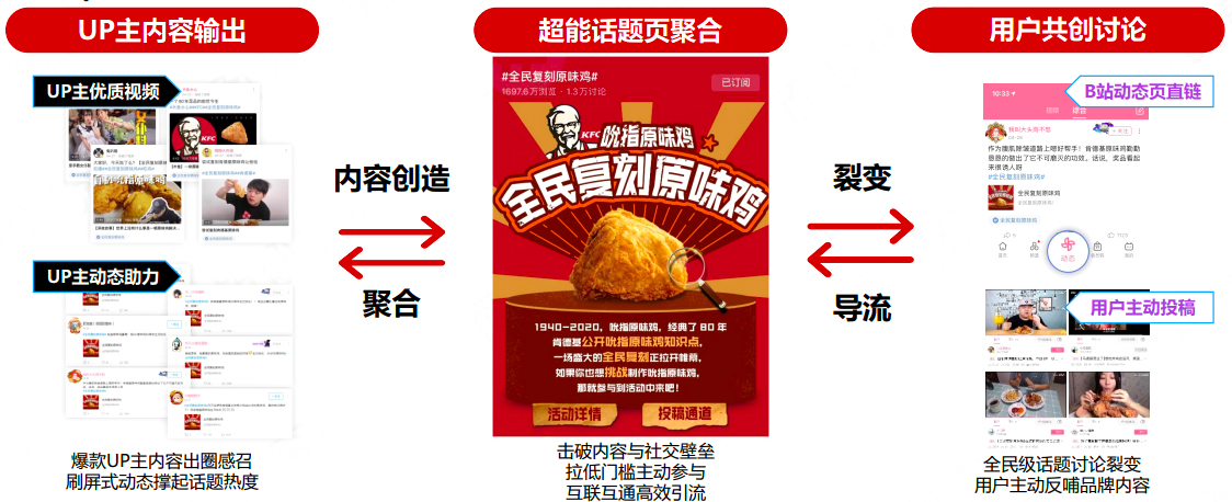 2020年5月,肯德基迎来吮指原味鸡80周年,希望趁周年节点打造品牌大事件,全面渗透年轻圈层引发群体共鸣,深度沟通品牌炸鸡文化。肯德基选择合作B站召集令,打造#全民复刻原味鸡#话题,联动UP主共创爆款内容,召用户参与品牌话题讨论。头部UP主商单播放量420万+,UP主动态浏览量260万+,活动话题冲上热门话题榜第1位,超能话题页1698W浏览,并为KFC企业专车号增粉20%+。