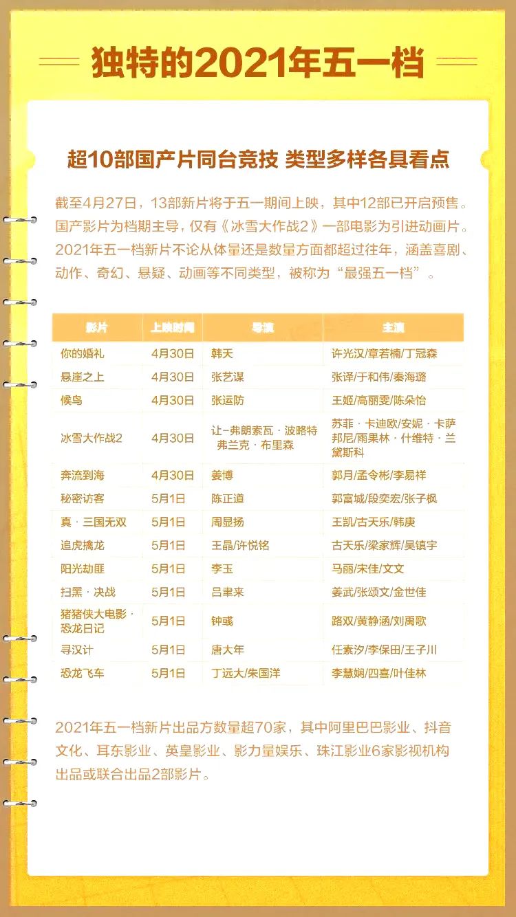影片扎堆上映背后,资本身影忙碌。据统计,2021年五一档新片出品方数量超70家。其中,阿里影业、抖音文化、英皇影业等6家影视机构,参与了2部档期新片的出品或联合出品。