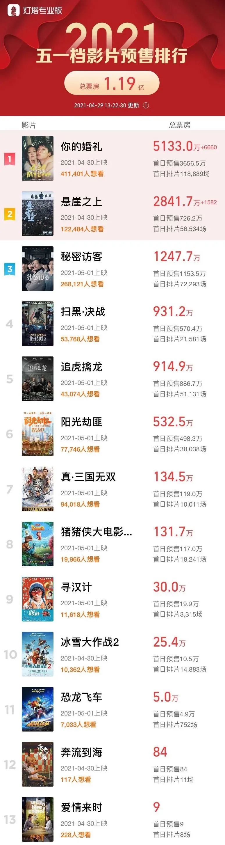 据灯塔专业版数据,4月30日晚上9点,五一档实时总票房(含预售)超1.2亿元,《你的婚礼》累计票房破1.3亿。