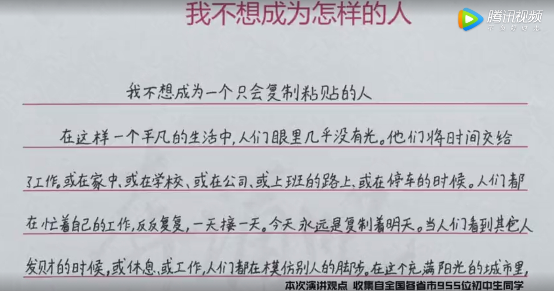 继去年五四青年节 B 站携手何冰老师推出宣言片《后浪》后,今年青年节 B 站收集了全国 955 位初中生的观点和演讲,发布了演讲视频《我不想做这样的人》。