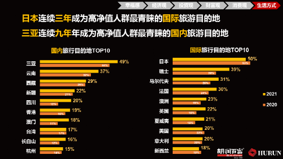 (3)国际旅游目的地:国际旅游热情提高37%。日本、瑞士、马尔代夫和法国为最青睐国际旅游目的地前四名。日本连续三年成为最青睐国际旅游目的地。美国、意大利和新西兰都有所下降,英国和夏威夷有所上升。胡润表示:“虽然疫情导致出境受到限制,但高净值人群对国际旅行的热情仍然旺盛。”