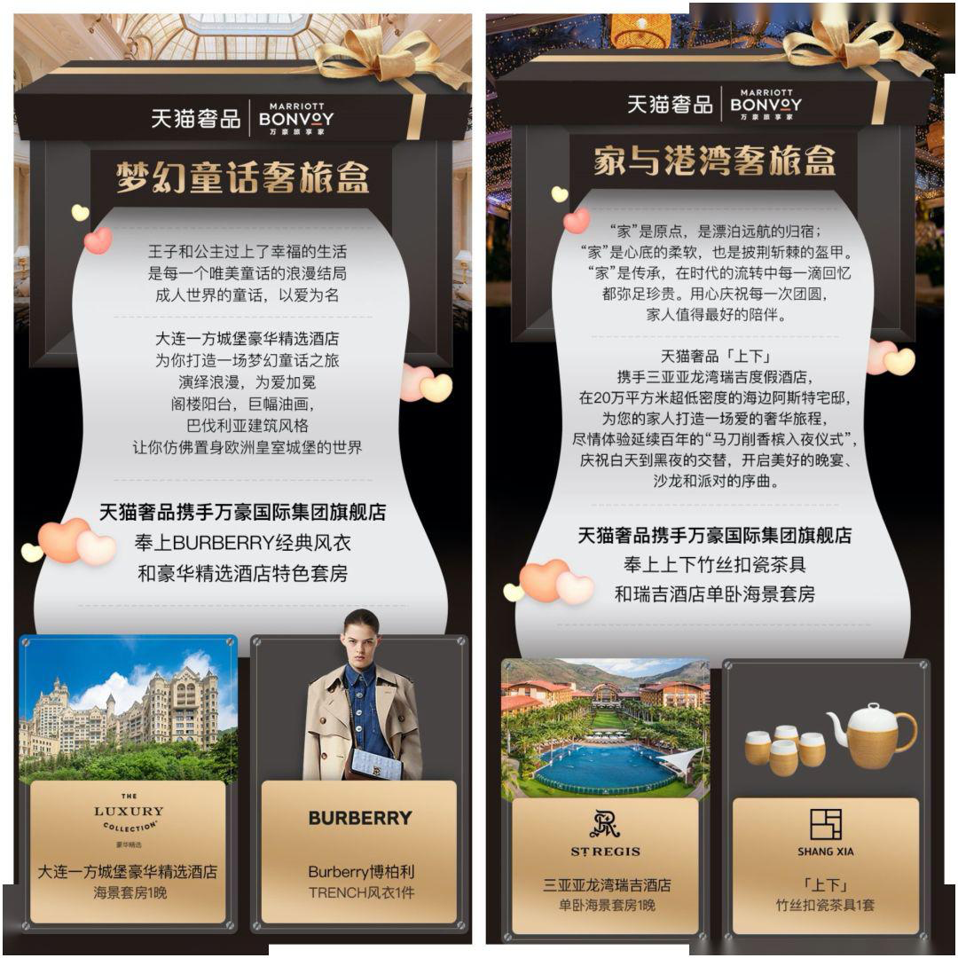 比如2020年天猫奢品联手万豪国际旗下奢华品牌酒店,跨界合作推出“奢旅日”活动,入驻天猫奢品的海蓝之谜、NET-A-PORTER、RIMOWA、上下等5大奢侈品牌,与万豪国际旗下奢华品牌酒店共同推出蕴含不同主题故事的六大“奢旅盒”。