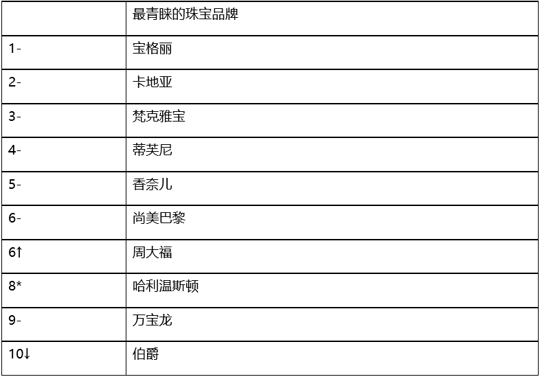 珠宝品牌排名稳定,前五名依然是宝格丽、卡地亚、梵克雅宝、蒂芙尼和香奈儿。宝格丽连续三年成为高净值人群最青睐的珠宝品牌。周大福上升两位,与尚美巴黎并列第六。哈利温斯顿新上榜。