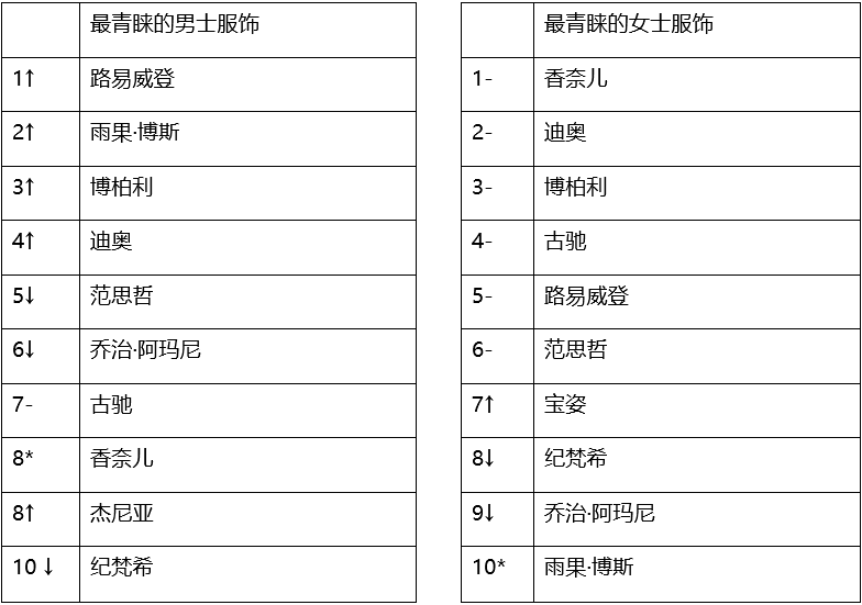 路易威登继续上升三位,成为最受青睐男士服饰品牌。雨果·博斯上升七位,排名第二。第三博柏利,上升三位。第四迪奥,上升一位。香奈儿新上榜。30岁以下高净值人群最青睐的男士服饰品牌,迪奥与路易威登并列第一。