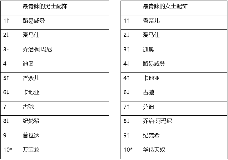 路易威登取代爱马仕成为最受青睐男士配饰。爱马仕下降至第二。乔治·阿玛尼和迪奥继续保持第三第四。香奈儿上升三位,位于第五。万宝龙新上榜。30岁以下高净值人群最青睐的男士配饰品牌也是路易威登。