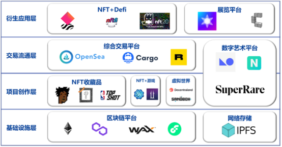 NFT生态应用从功能属性上可分为四层;基础设施底层、项目创作层、交易流通层、衍生应用层。