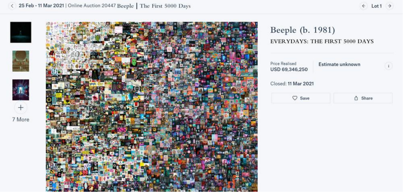 2021年3月11日,Beeple这件NFT作品以6934.6万美元 (约合人民币4.5亿元) ,在佳士得拍卖行成交。《每一天》创下了NFT作品拍卖的纪录,也一举让Beeple成为目前健在艺术家拍卖的单个艺术品排行中的第三贵。Beeple的《每一天》天价成交,成为NFT吸引媒体围观并大肆宣传的起点。