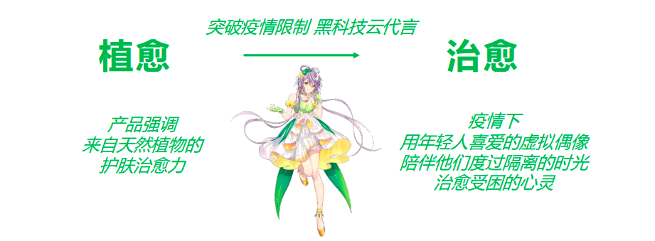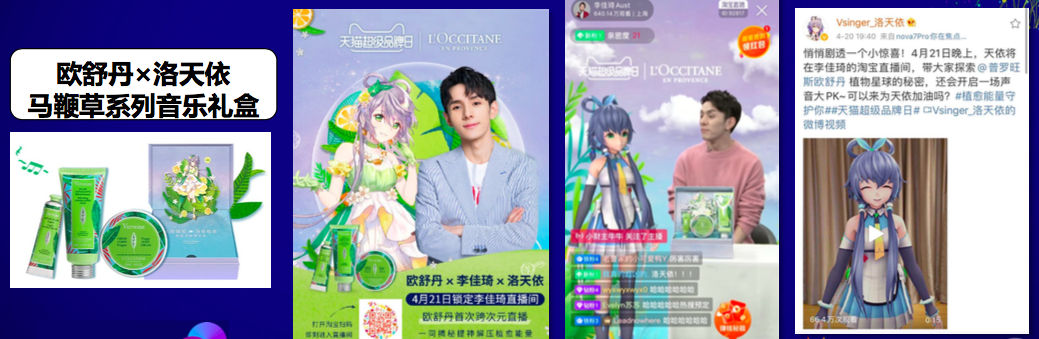 主打天然原料、纯净自然的法国护肤品牌欧舒丹,在疫情下因明星拍摄受限,实施了虚拟偶像“云代言”的创新手法,采用欧舒丹产品中的植物元素,为洛天依打造了“欧舒丹植愈精灵”定制形象,以此提升品牌在年轻人中的好感度,扩充年轻消费者圈层。