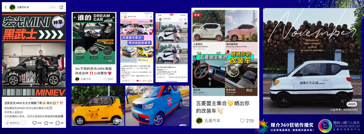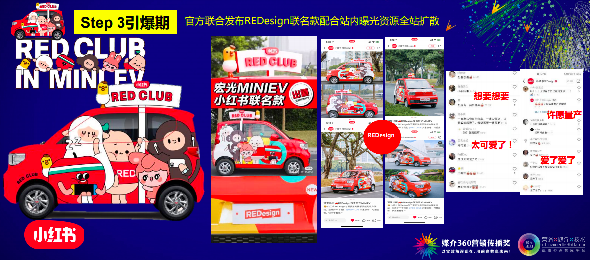 然后,以外观、潮流角度达成平台、用户匹配;最终,五菱汽车与小红书共同发起一场年轻人的潮装盛事,小红书设计品牌Redesign首发参与打造“萌趣小红车”,共同激发了五菱潮装狂欢。