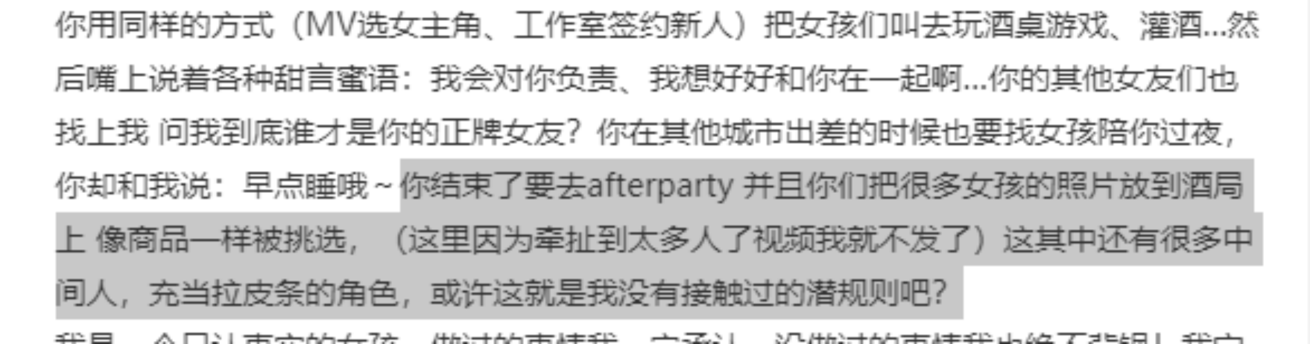 在都美竹的系列爆料中,有些针对的是个人情感、纠纷、道德等层面,这些属于私域;但是有些指控,比如“灌酒后趁对方不清醒发生性关系”已经指向性质十分严重的违法犯罪,且爆料还称涉及多人甚至未成年人。这就让该事件脱离口水,有了鲜明的公共意义。