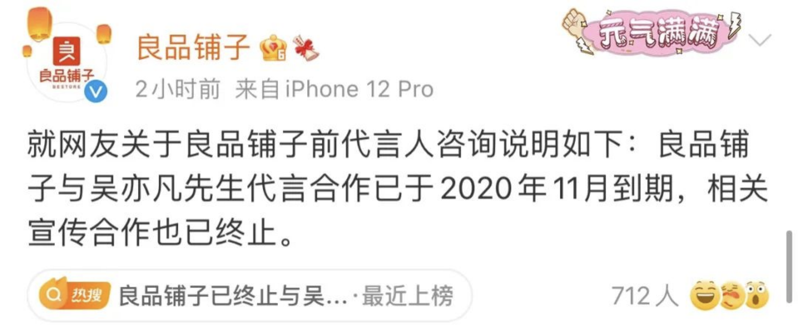 良品铺子发表声明,和吴亦凡到期,不会续签!