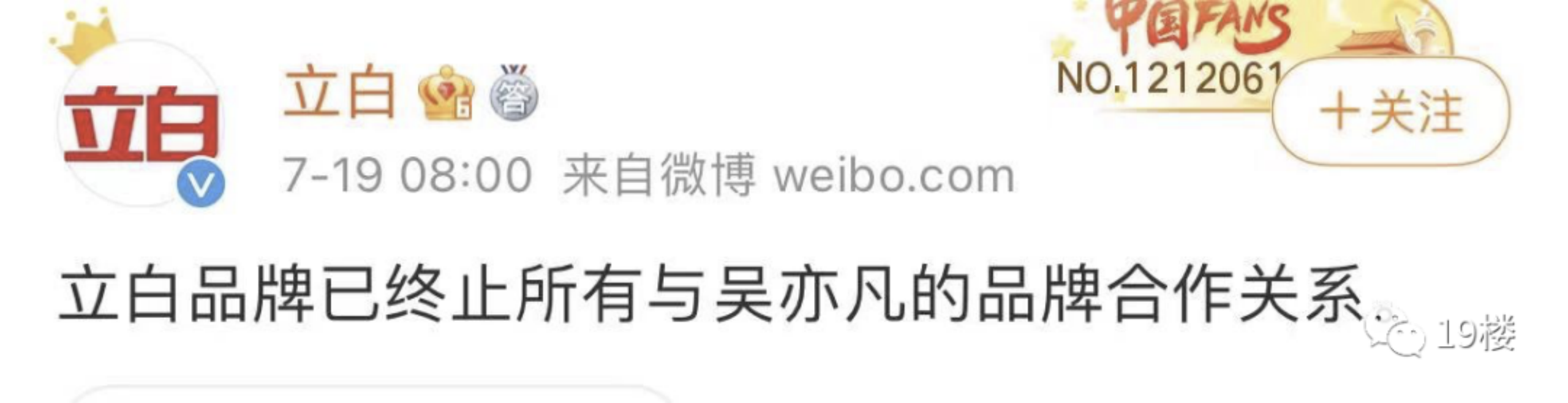 立白品牌发微博称:已终止所有与吴亦凡的品牌合作关系。