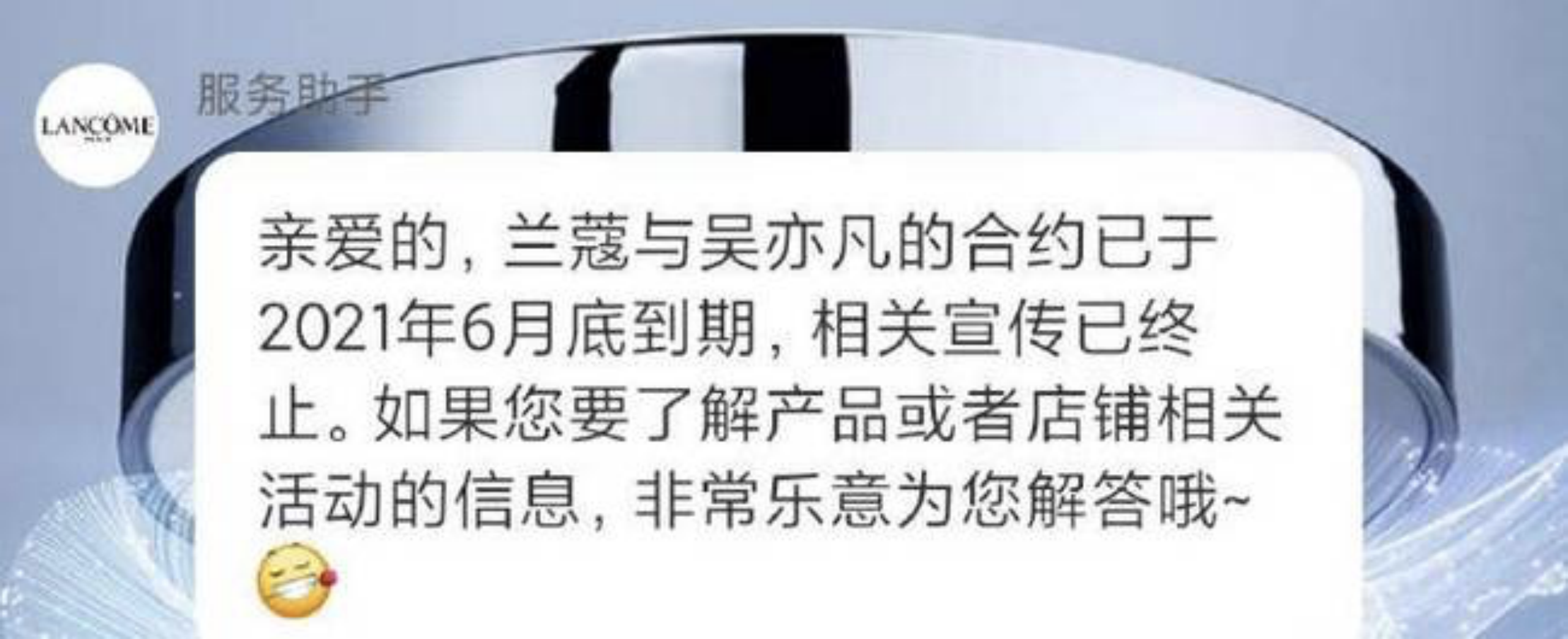 7月19日,兰蔻品牌已终止所有与吴亦凡的品牌合作关系。