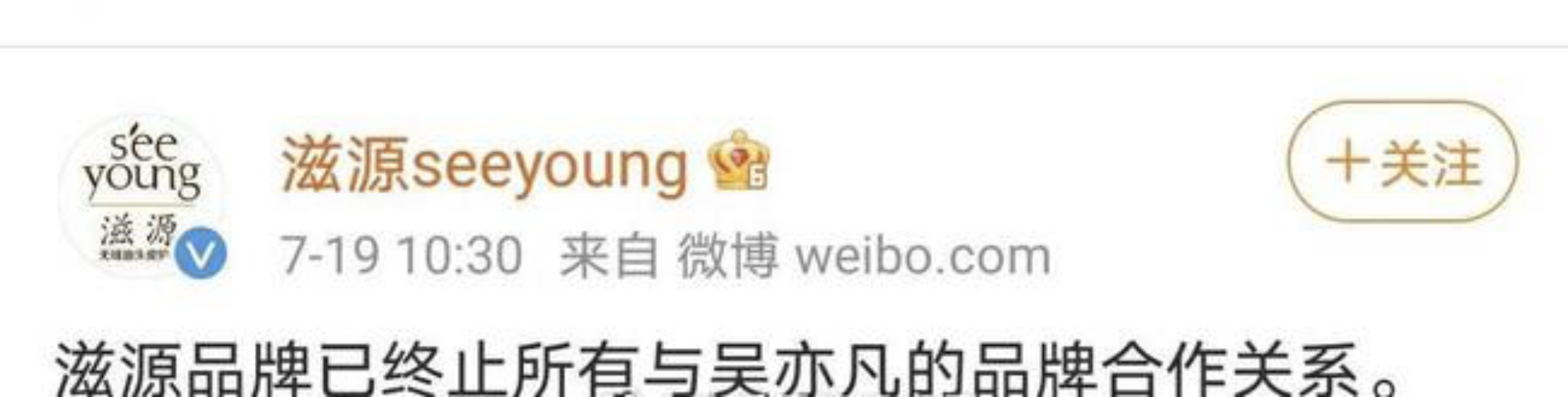滋源品牌发文宣布与吴亦凡终止合约:“滋源品牌已终止所有与吴亦凡的品牌合作关系。 ”