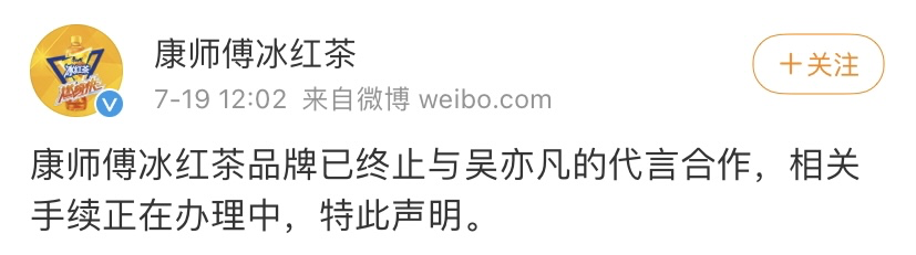 康师傅冰红茶官方微博发文称,康师傅冰红茶品牌已终止与吴亦凡的代言合作,相关手续正在办理中,特此声明。