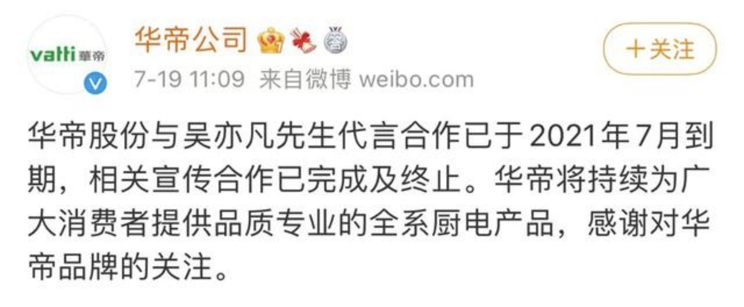 @华帝公司 微博发文称,华帝股份与吴亦凡先生代言合作已于2021年7月到期,相关宣传合作已完成及终止。