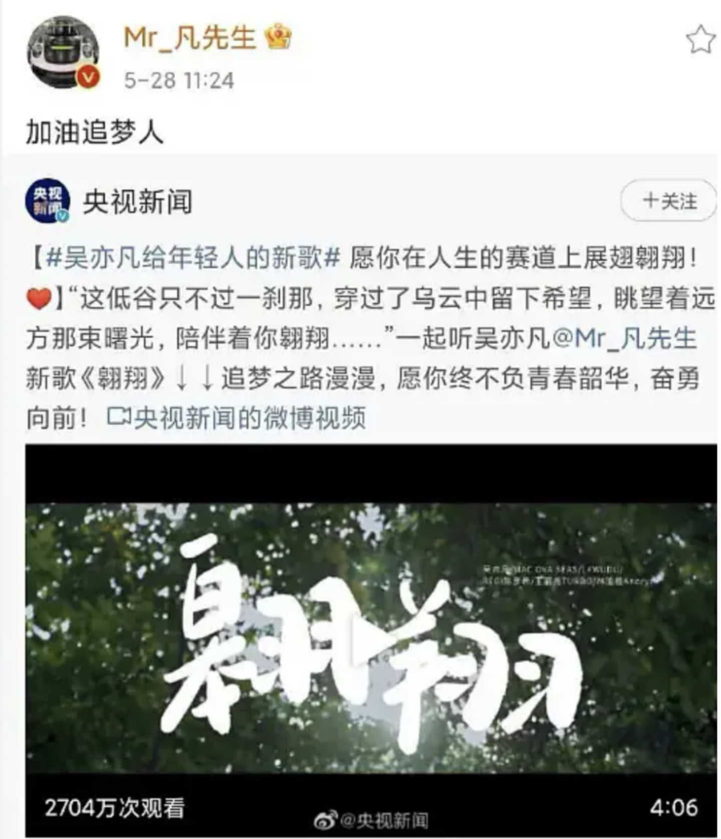 央视新闻原本置顶了他的新歌《翱翔》,配合天问一号,激励年轻人,吴亦凡也转发了,现在已经删除!