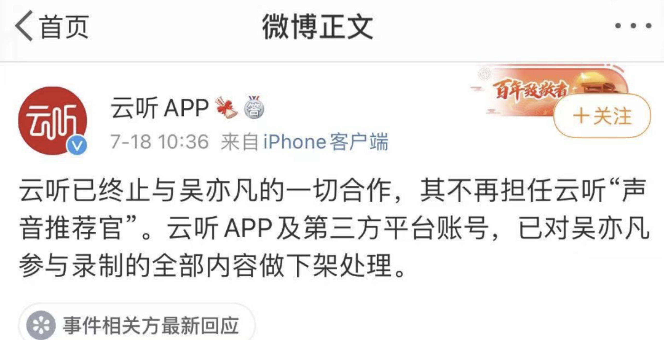 几乎在同一时间,各大品牌纷纷表态,和他撇清关系。