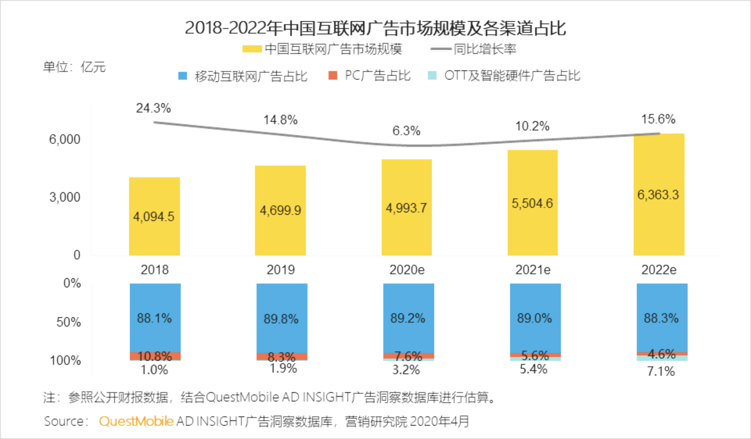 受疫情影响,全网用户对移动互联网依赖度进一步加深,人均单日使用时长及打开APP个数均有一定程度提升。Quest mobile数据显示,移动端占比已经接近90%,预计未来两年,OTT及智能硬件还将进一步挤占PC广告,由2019年的1.9%增长到2022年的7.1%,到时候,PC广告可能就只剩下4.6%。
