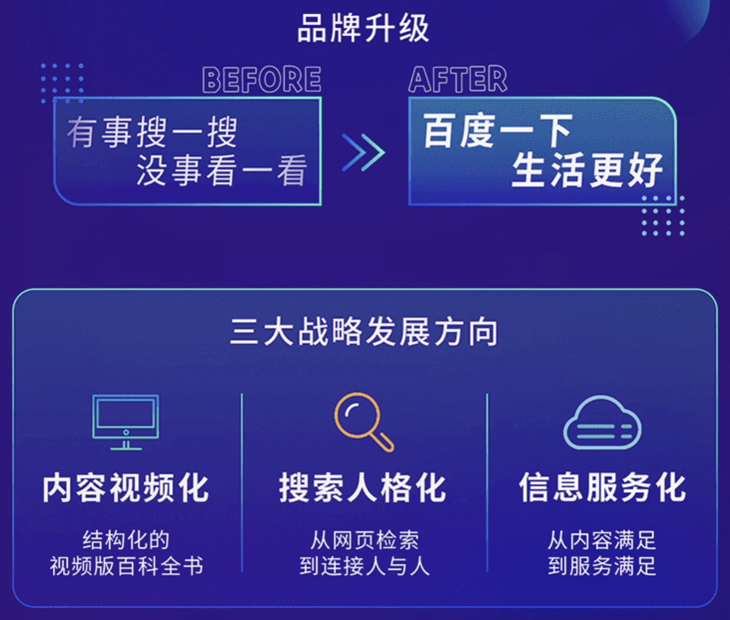 互联网基础设施日益完善,整个社会信息度在提升,用户希望更快速的完成闭环需求,百度正是基于这一需求的变化,提出“人格化”和“服务化”战略,让用户在百度移动生态的每一个场景下都能获得所见即所得的服务。尤其是在一些关键行业,百度要通过自建的方式去深入产业建设服务闭环,比如大健康、直播、短视频、教育等领域。