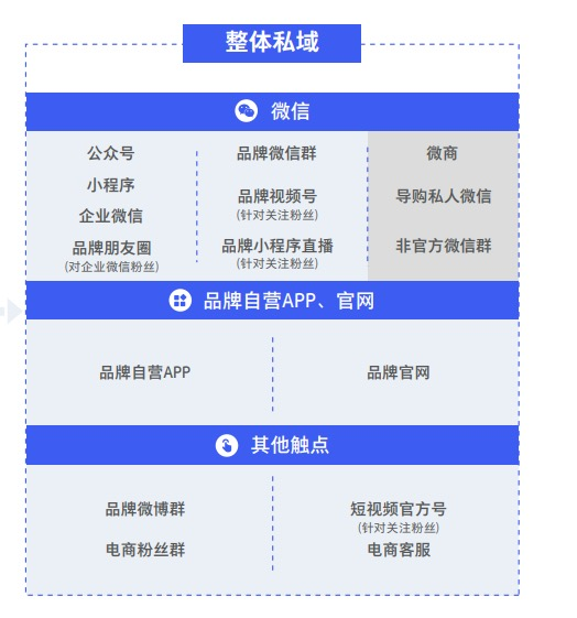从调研结果来看,整体私域场景主阵地来自微信,其次是品牌自营app、官网以及其他触点。