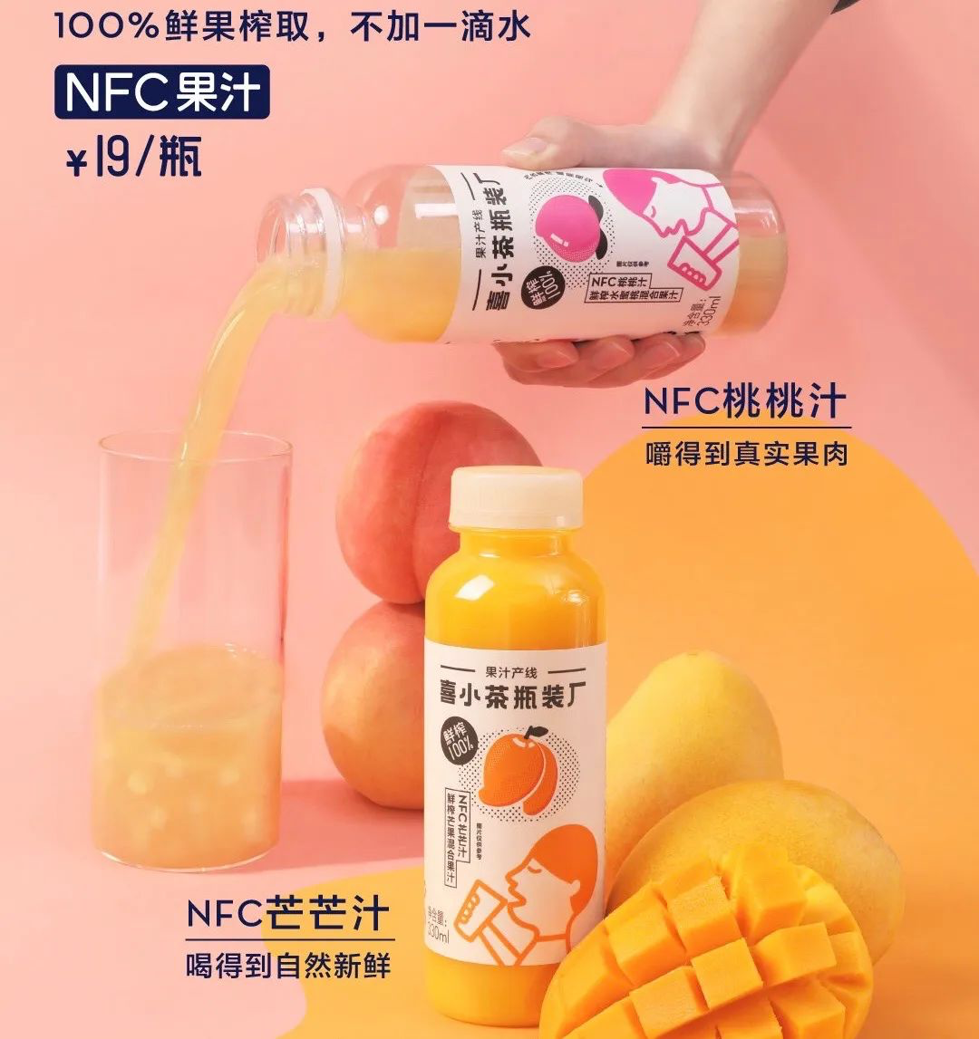 随着人们健康意识的不断提高,“高浓度、原生态、不添加”将是果汁行业的未来趋势。比如喜小茶发行的NFC产品有芒果和桃子两个口味,标榜0添加、0脂肪、不额外加糖、不加一滴水,冷灌装保存营养成分,全程冷链。