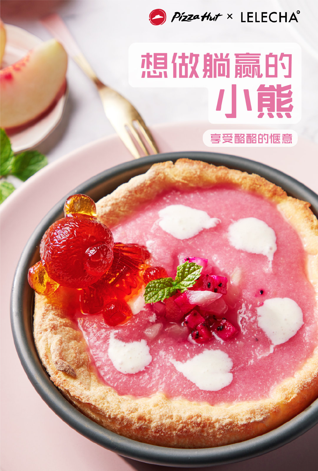 比如必胜客和乐乐茶做了一次联名策划。布丁做成的小熊“躺”在了披萨面饼上,芝士披萨饼里是乐乐茶的无花果桃子酪酪,这是一款可以吸的披萨。