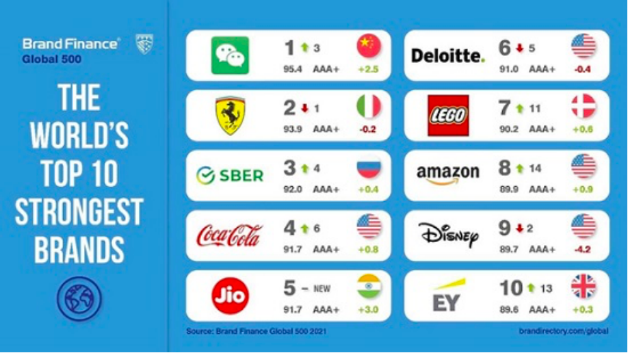 全球权威机构品牌金融(Brand Finance)发布了最新的《2021年全球品牌价值500强报告》。苹果被评为全球最有价值品牌,中国品牌中国工商银行和微信进入前10名。