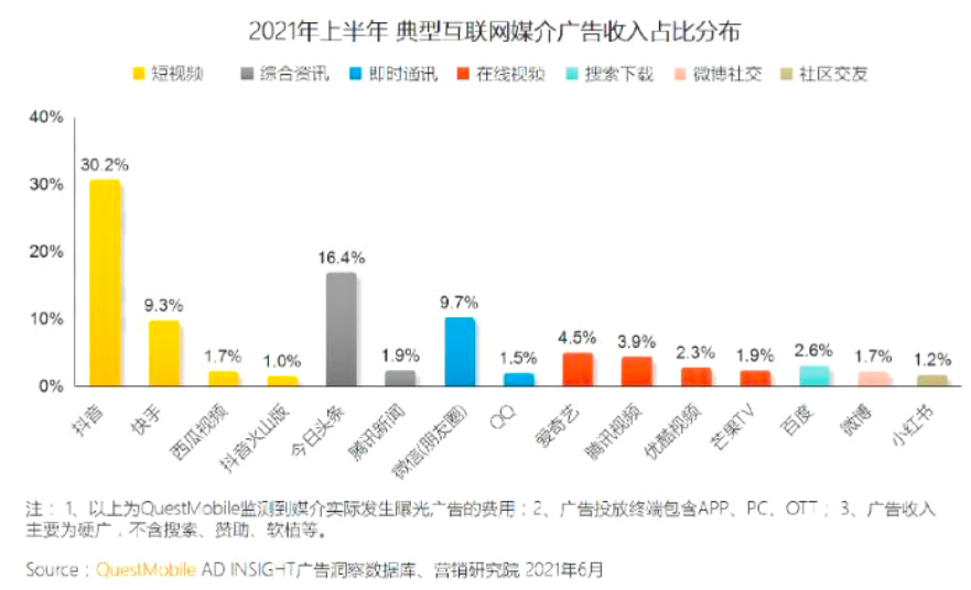 2021年上半年互联网广告收入排行中,抖音、今日头条,微信(朋友圈)位列前三,相较于其他平台,这三家是能给商家带来直接的利益回流的。如今,企业越来越注重广告效果,只有打通公域和私域,完成流量转化的平台,才能获得更多广告收入。