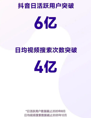 在第二届抖音创作者大会上,抖音发布数据称,截至2020年8月,包含抖音火山版在内,抖音的日活跃用户已经超过了6亿。截至2020年12月,抖音日均视频搜索次数则突破4亿。