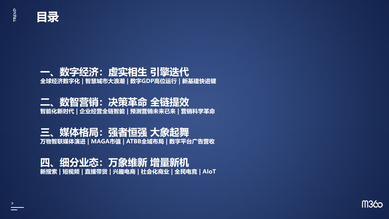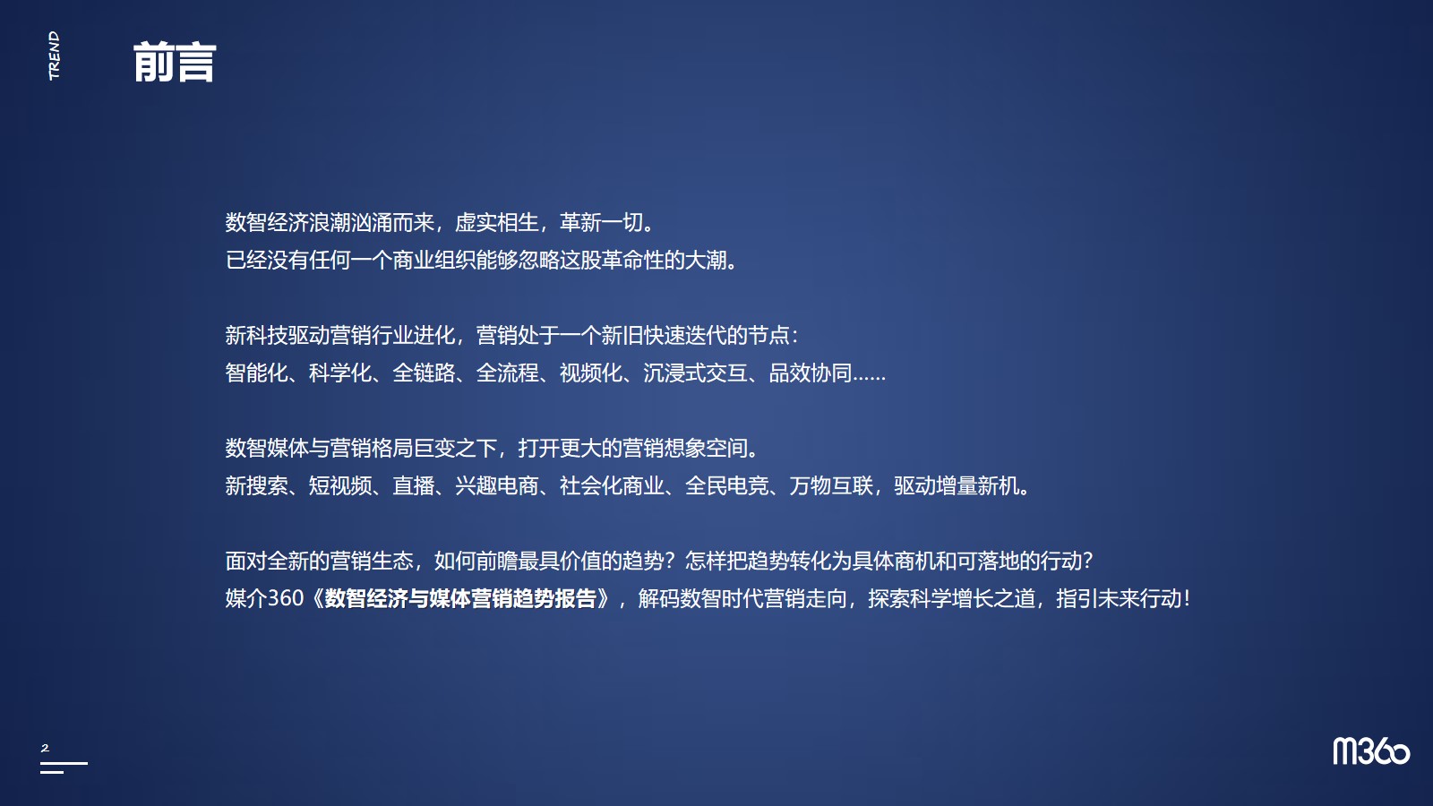 媒介360推出《数智经济与媒体营销趋势报告》,解码数智时代营销走向,为营销投资指点迷津,并重点解读新搜索、短视频、直播、兴趣电商、社会化商业、全民电竞、万物互联等七大领域媒体趋势、营销指南与实战案例,探索实效增长之道,指引未来行动!