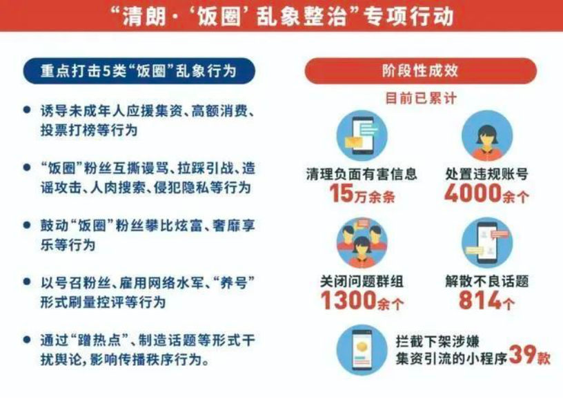 鉴于此,8月27日,中央网信办发布通知,进一步加强“饭圈”乱象问题治理。要求取消所有涉明星艺人个人或组合的排行榜单,严禁新增或变相上线个人榜单及相关产品或功能。目前,微博不再显示明星超话的排名,抖音已下架明星榜,快手也下架明星榜。
