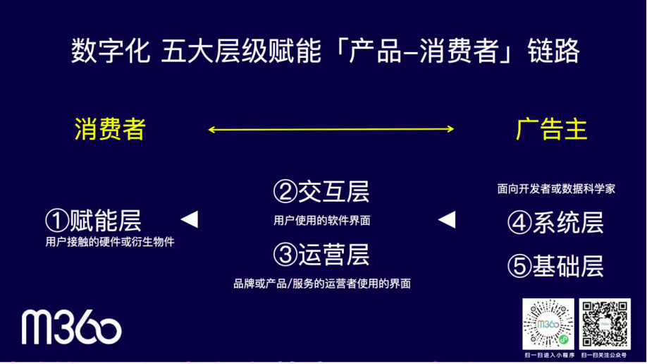 我们看到,数字化颠覆了营销行业的传统链路,也重新定义了广告投放,简单而言,数字化从五个层面,扭转了品牌运营,(从前端到后端)分别是: