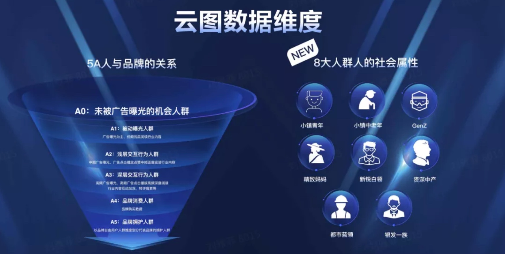 随着品牌对用户运营与生意提效的需求不断升级,巨量云图平台也在进一步优化经营工具的精准度,推出"5A+8大人群"策略。8大人群,即小镇青年、小镇中老年、Z世代、精致妈妈、新锐白领、资深中产、都市蓝领以及都市银发,本质是8个高购买能力人群标签,通过对抖音月活用户和电商历史存量用户进行全盘扫描,以城市等级、年龄、消费力、人生阶段等指标综合聚类,把消费者横向划分为8大人群,遍布5A流转的每⼀个阶段。