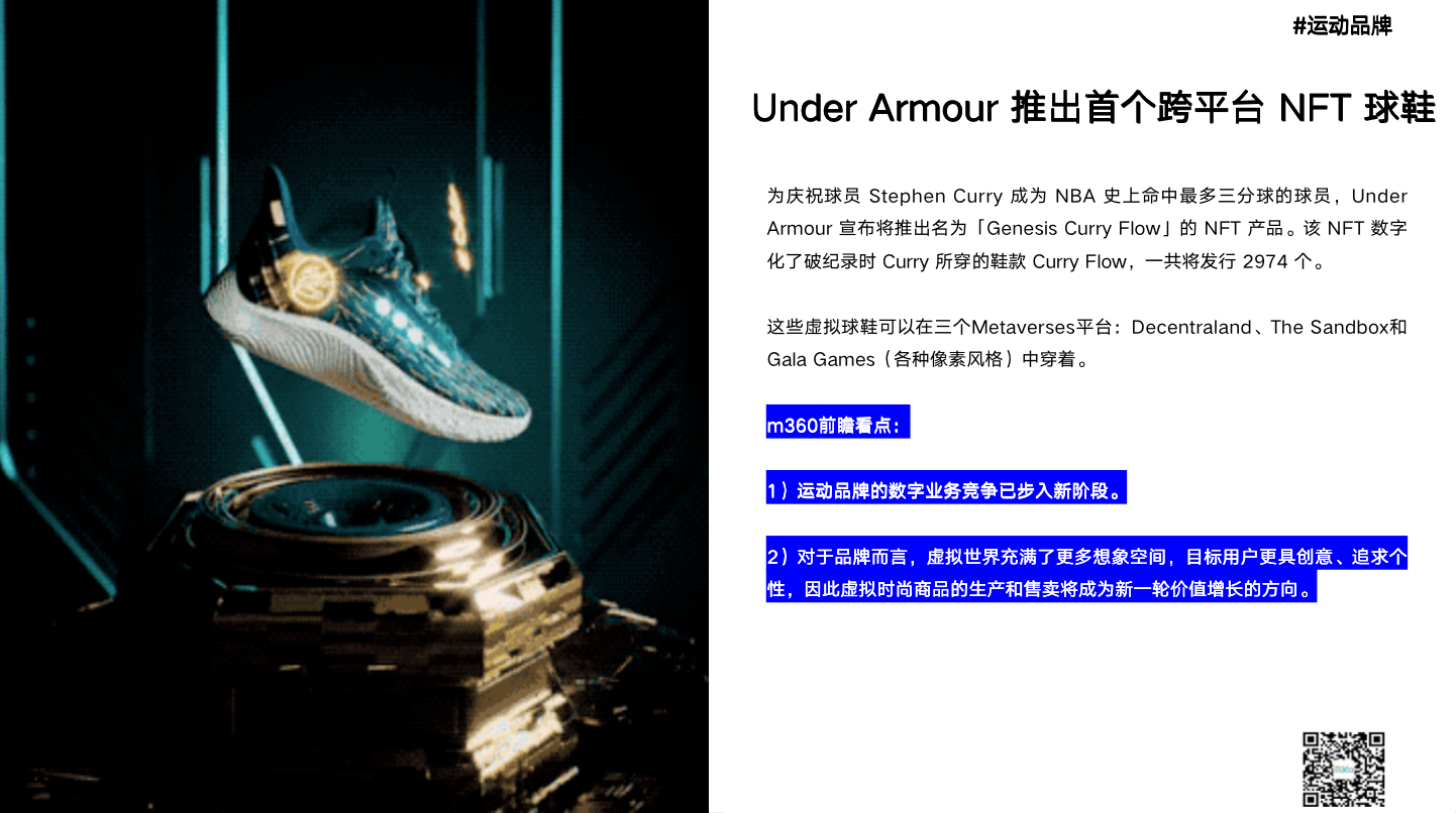 为庆祝球员 Stephen Curry 成为 NBA 史上命中最多三分球的球员,Under Armour 宣布将推出名为「Genesis Curry Flow」的 NFT 产品。该 NFT 数字化了破纪录时 Curry 所穿的鞋款 Curry Flow,一共将发行 2974 个。