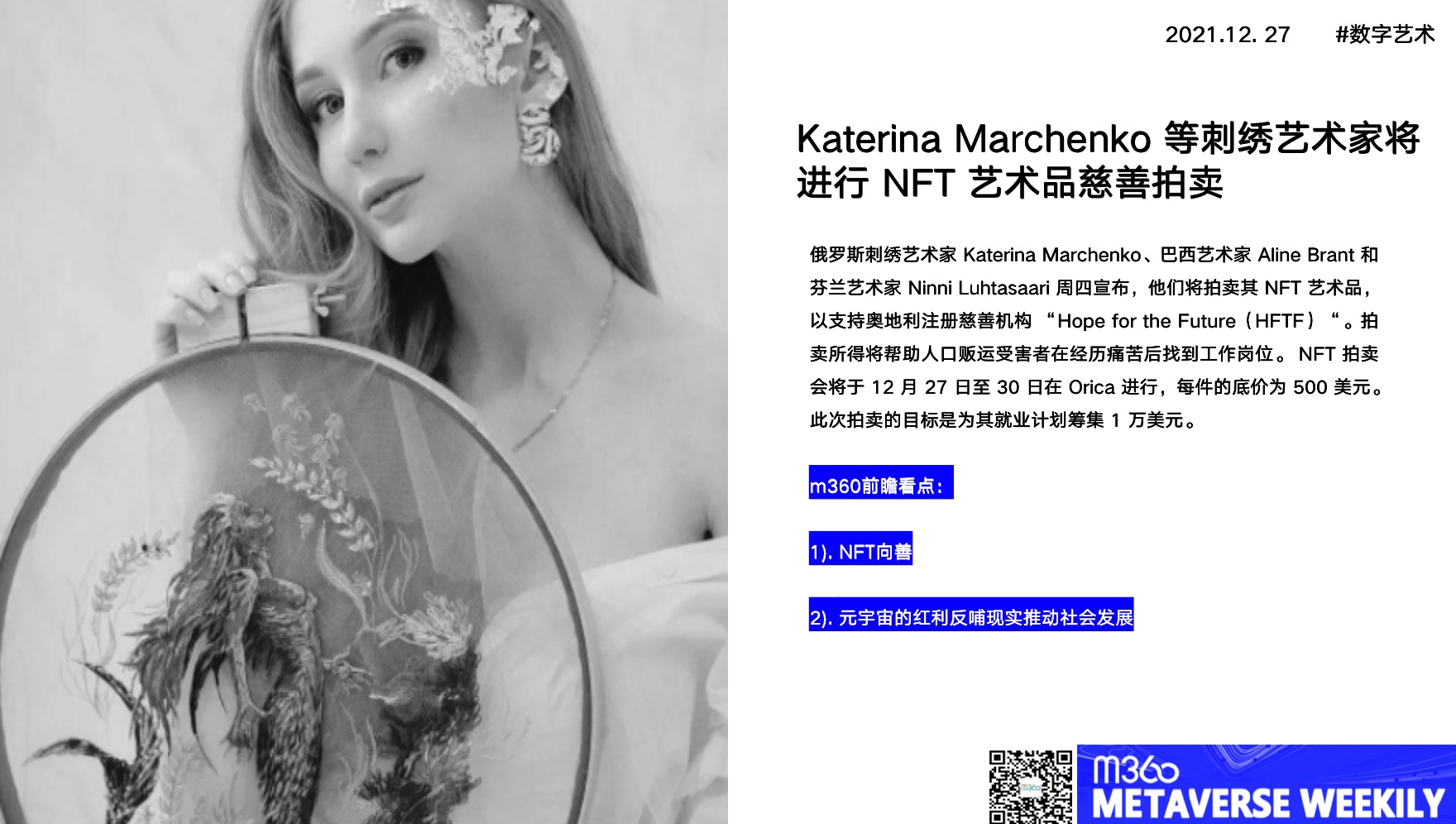 俄罗斯刺绣艺术家 Katerina Marchenko、巴西艺术家 Aline Brant 和芬兰艺术家 Ninni Luhtasaari 周四宣布,他们将拍卖其 NFT 艺术品,以支持奥地利注册慈善机构 “Hope for the Future(HFTF)“。拍卖所得将帮助人口贩运受害者在经历痛苦后找到工作岗位。 NFT 拍卖会将于 12 月 27 日至 30 日在 Orica 进行,每件的底价为 500 美元。此次拍卖的目标是为其就业计划筹集 1 万美元。