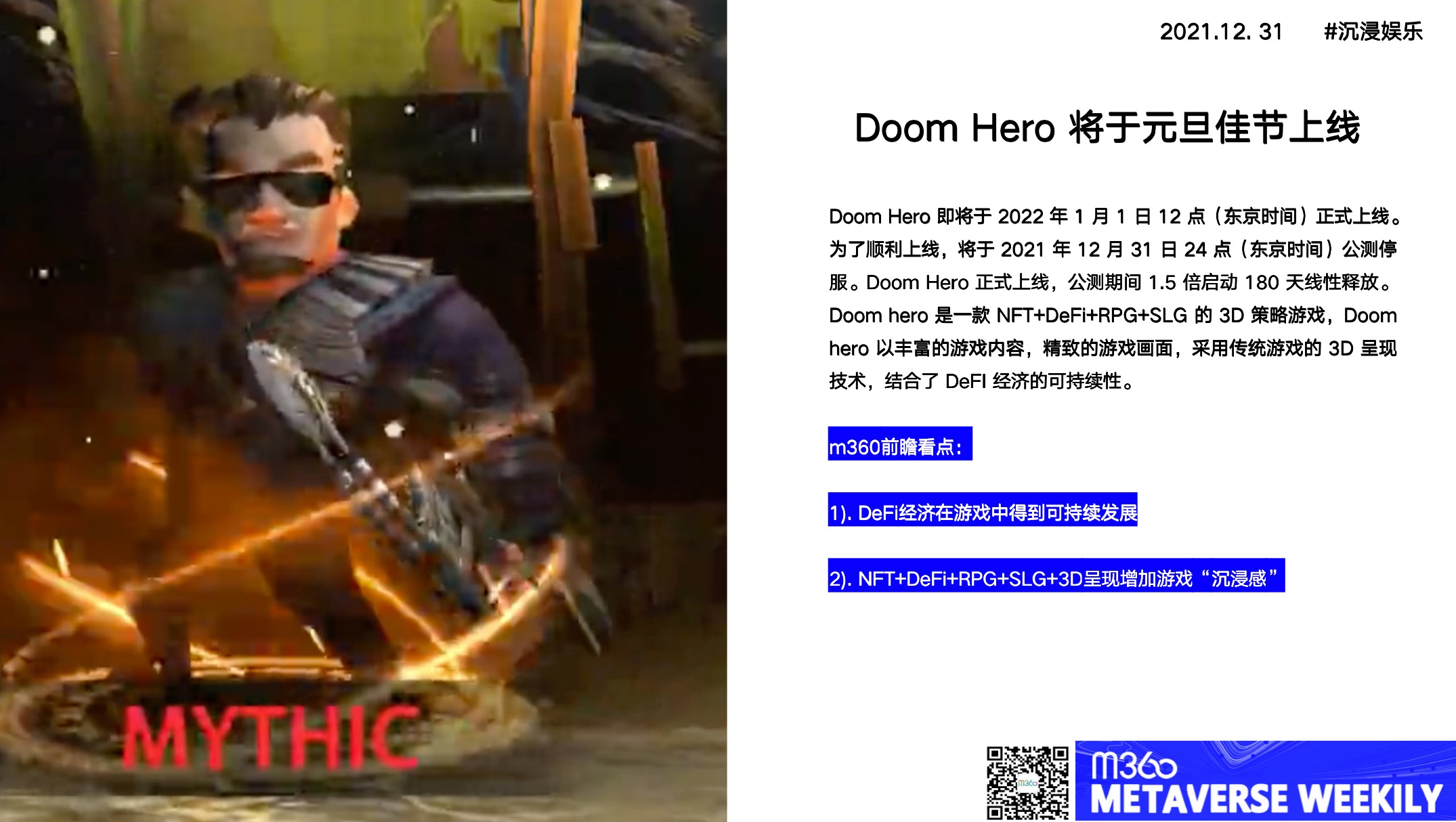 Doom Hero 即将于 2022 年 1 月 1 日 12 点(东京时间)正式上线。为了顺利上线,将于 2021 年 12 月 31 日 24 点(东京时间)公测停服。Doom Hero 正式上线,公测期间 1.5 倍启动 180 天线性释放。 Doom hero 是一款 NFT+DeFi+RPG+SLG 的 3D 策略游戏,Doom hero 以丰富的游戏内容,精致的游戏画面,采用传统游戏的 3D 呈现技术,结合了 DeFI 经济的可持续性。
