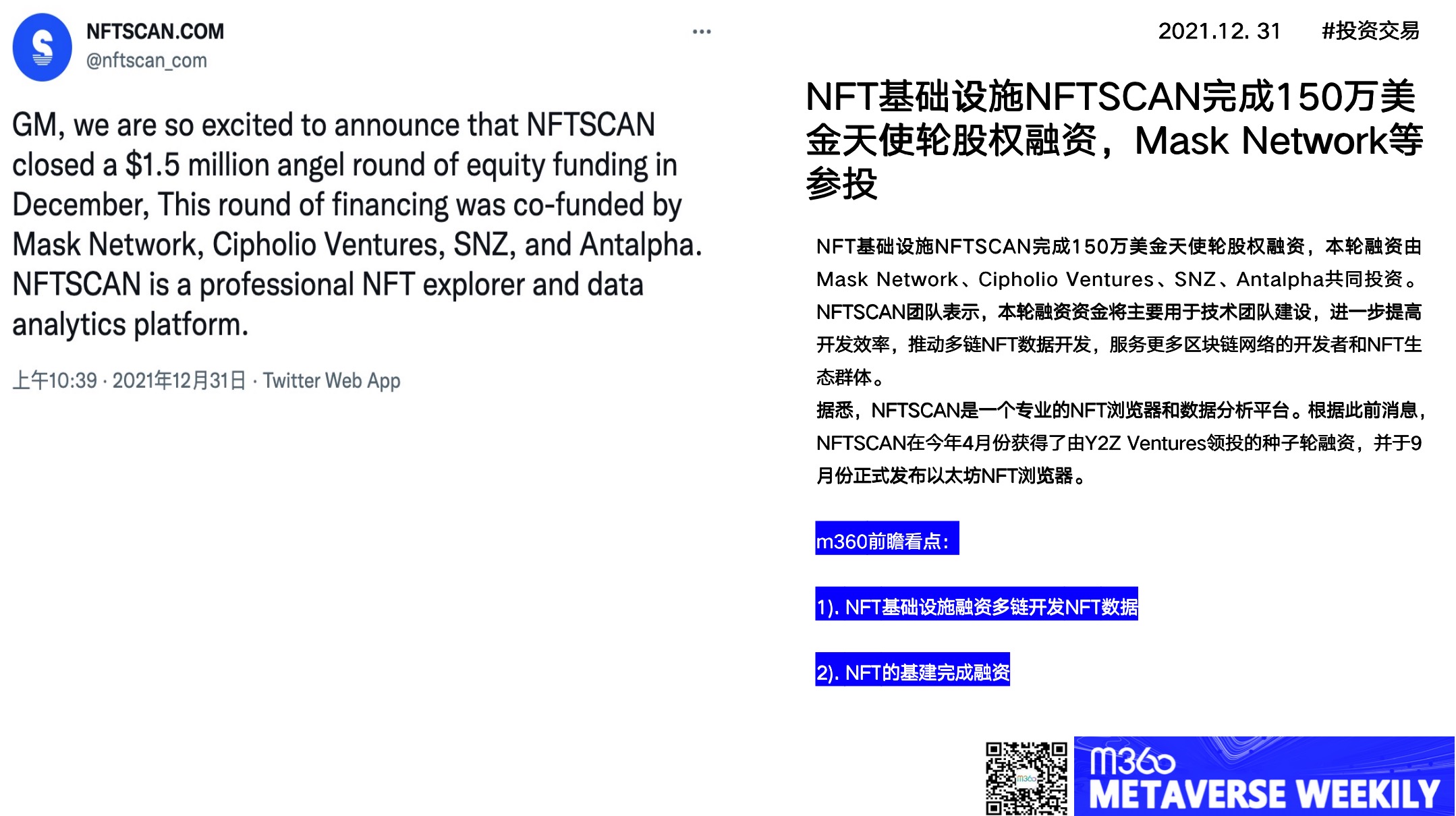NFT基础设施NFTSCAN完成150万美金天使轮股权融资,本轮融资由Mask Network、Cipholio Ventures、SNZ、Antalpha共同投资。NFTSCAN团队表示,本轮融资资金将主要用于技术团队建设,进一步提高开发效率,推动多链NFT数据开发,服务更多区块链网络的开发者和NFT生态群体。 据悉,NFTSCAN是一个专业的NFT浏览器和数据分析平台。根据此前消息,NFTSCAN在今年4月份获得了由Y2Z Ventures领投的种子轮融资,并于9月份正式发布以太坊NFT浏览器。