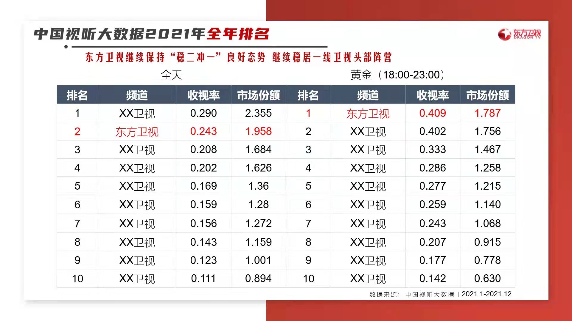 回顾2021年全年,中国视听大数据2021年全年排名显示,东方卫视的收视继续保持“稳二冲一”良好态势,继续稳居一线卫视头部阵营,连续两年蝉联黄金(18:00-23:00)收视第一,周末保持“321”竞争力,周日稳居第一;剧场方面,东方剧场2021年收视再度夺魁,市场份额达2.128%,“第一剧场”优势进一步凸显。