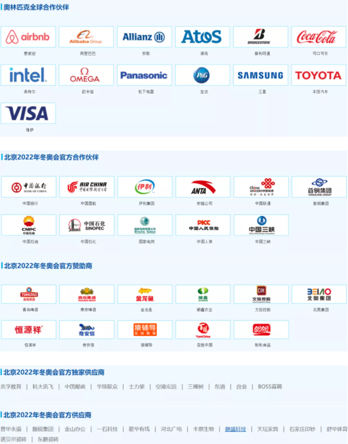 截至目前,除去13家奥林匹克全球赞助商外,北京冬奥会已经成功签约了4个层级共45家赞助商,其中包括11家官方合作伙伴、11家官方赞助商、10家官方独家供应商和13家官方供应商。