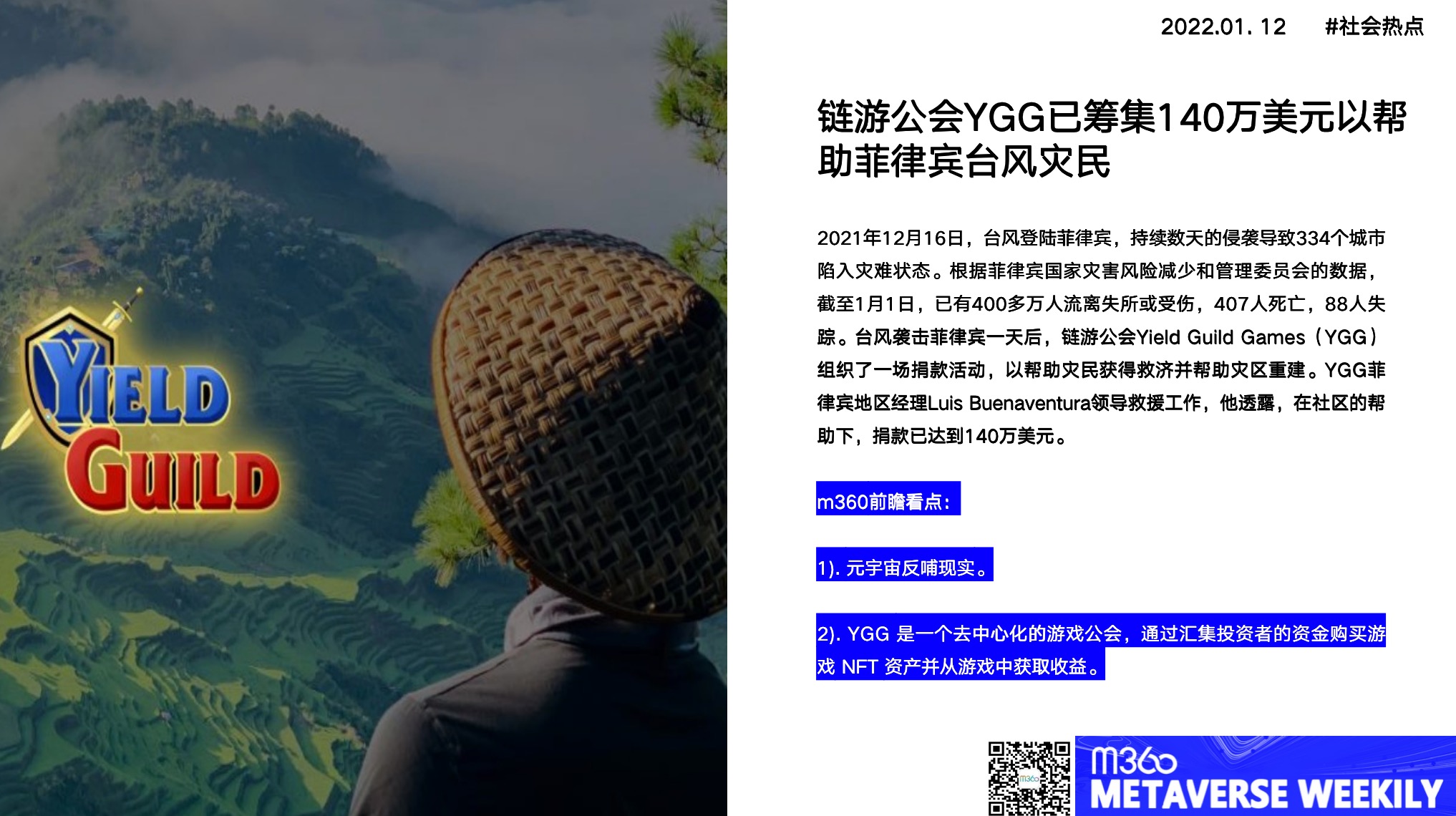 2021年12月16日,台风登陆菲律宾,持续数天的侵袭导致334个城市陷入灾难状态。根据菲律宾国家灾害风险减少和管理委员会的数据,截至1月1日,已有400多万人流离失所或受伤,407人死亡,88人失踪。台风袭击菲律宾一天后,链游公会Yield Guild Games(YGG)组织了一场捐款活动,以帮助灾民获得救济并帮助灾区重建。YGG菲律宾地区经理Luis Buenaventura领导救援工作,他透露,在社区的帮助下,捐款已达到140万美元。