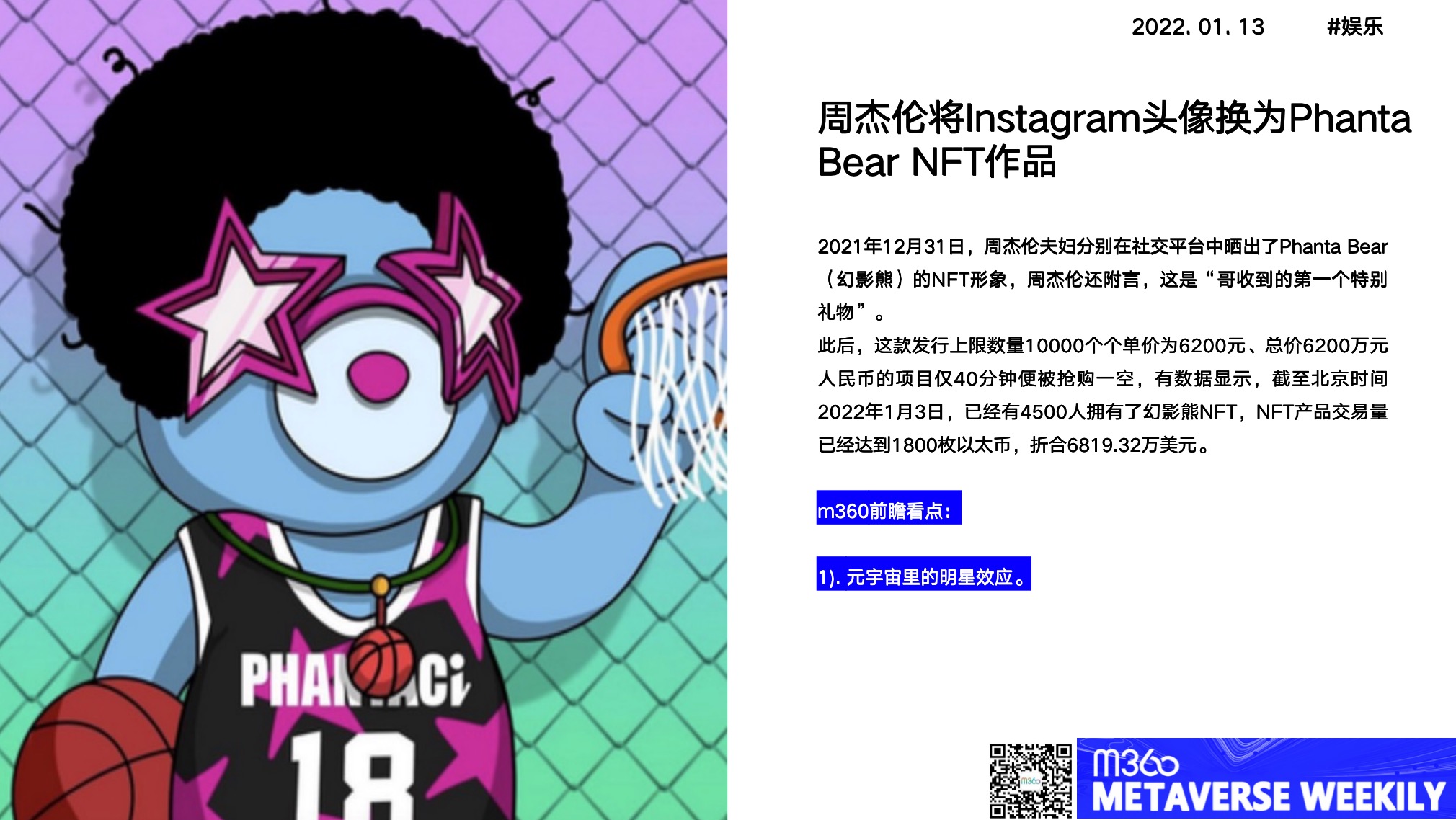 2021年12月31日,周杰伦夫妇分别在社交平台中晒出了Phanta Bear(幻影熊)的NFT形象,周杰伦还附言,这是“哥收到的第一个特别礼物”。 此后,这款发行上限数量10000个个单价为6200元、总价6200万元人民币的项目仅40分钟便被抢购一空,有数据显示,截至北京时间2022年1月3日,已经有4500人拥有了幻影熊NFT,NFT产品交易量已经达到1800枚以太币,折合6819.32万美元。